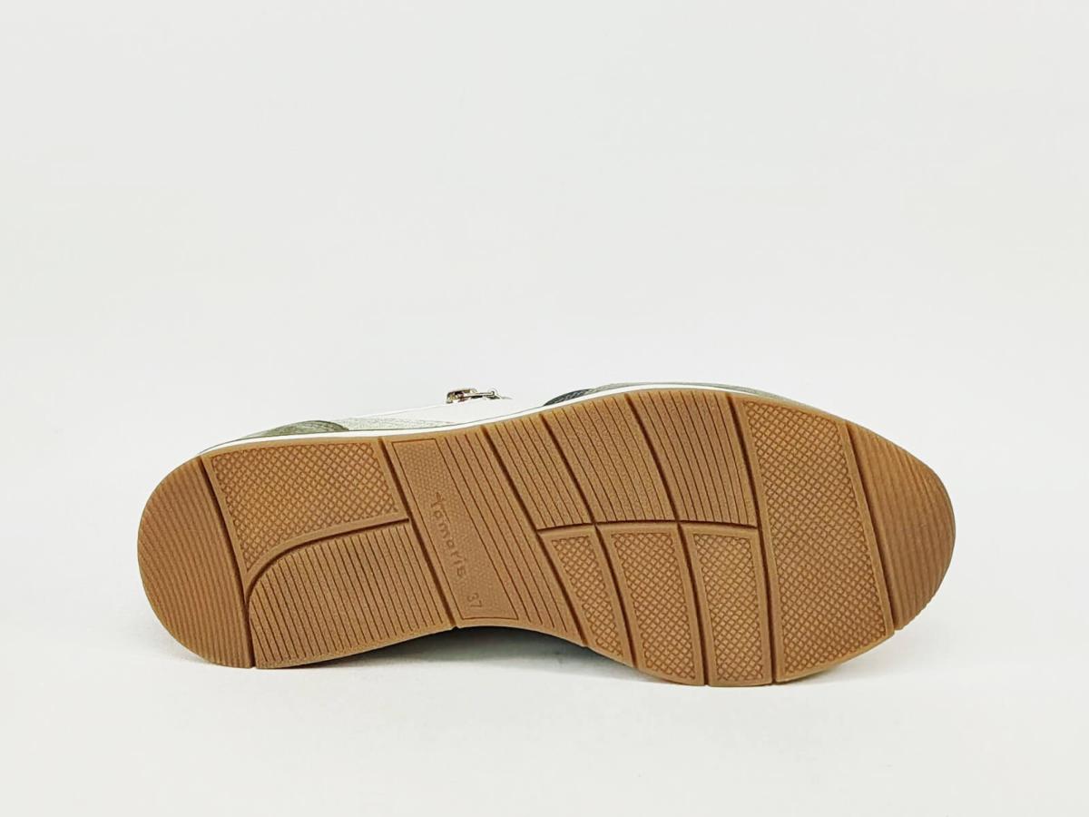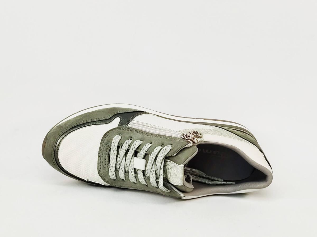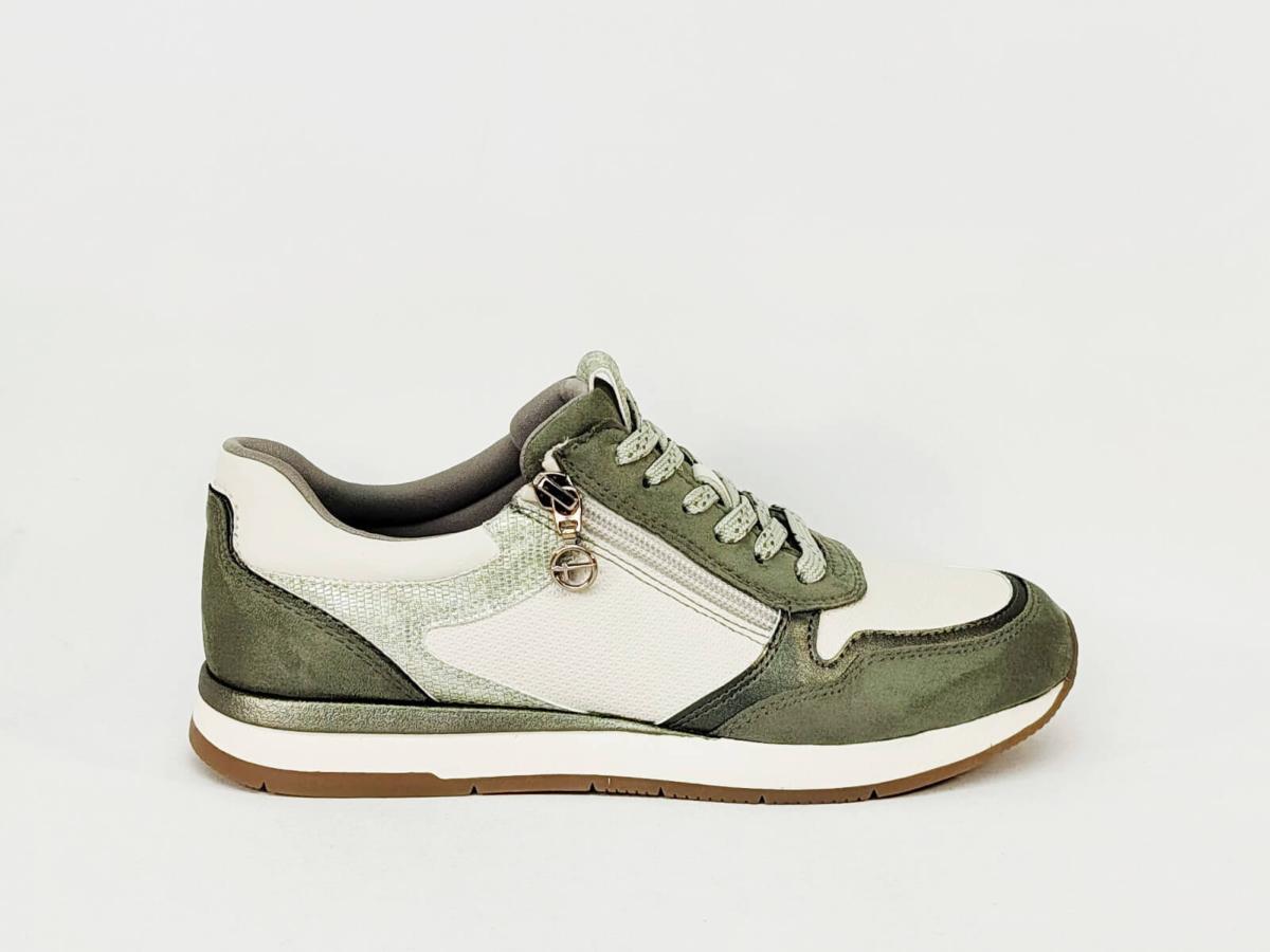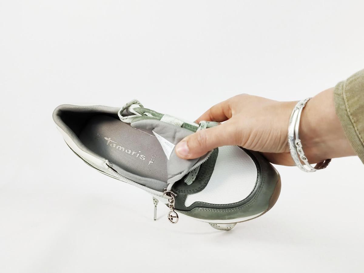 Sneakers femme TAMARIS 23613 vert sage, basket chic et confortable semelle moelleuse avec zip et lacets à petit prix, végane.