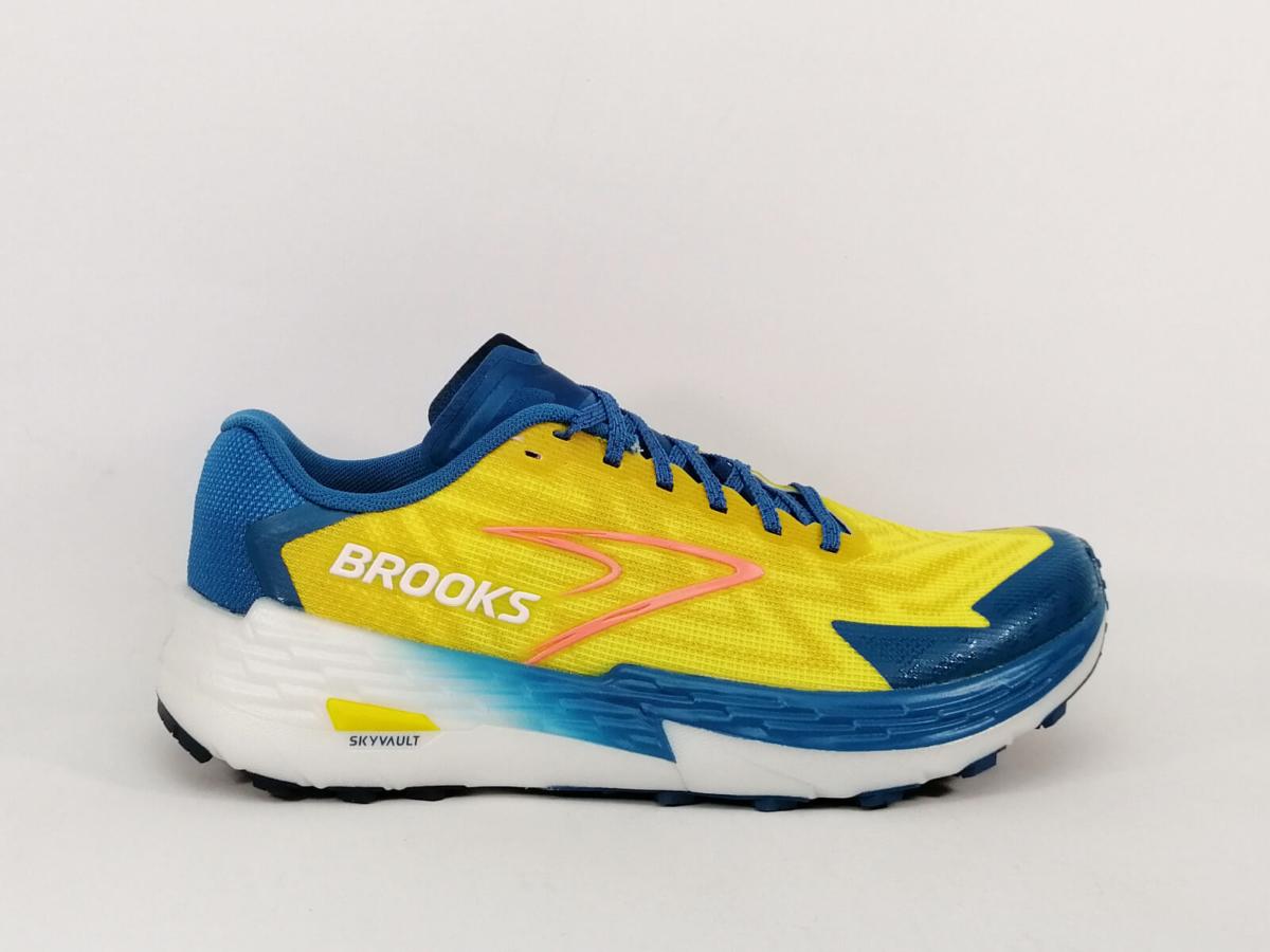 Basket de trail homme, grand amorti, très bonne adhérence et surtout le confort ! en destockage BROOKS catamount 4 jaune bleu à prix cassé.