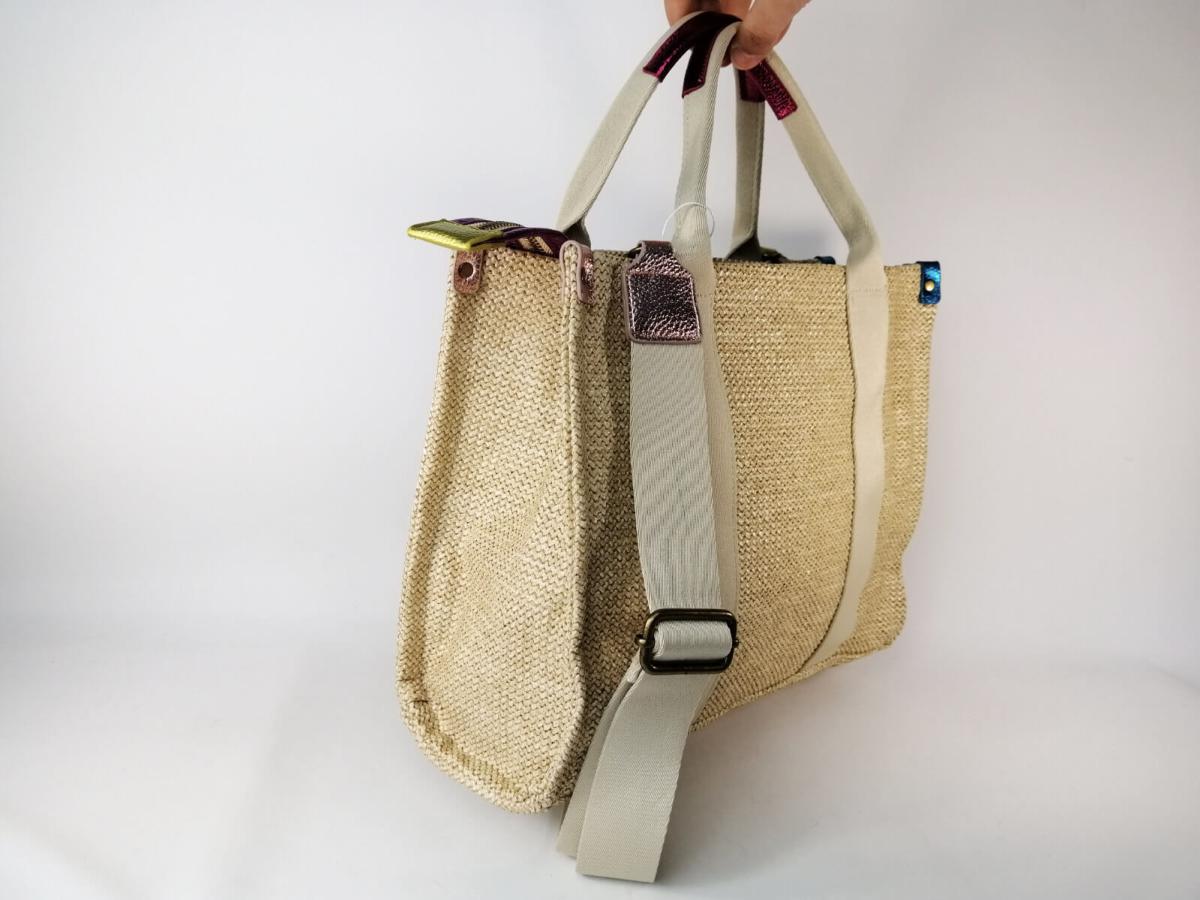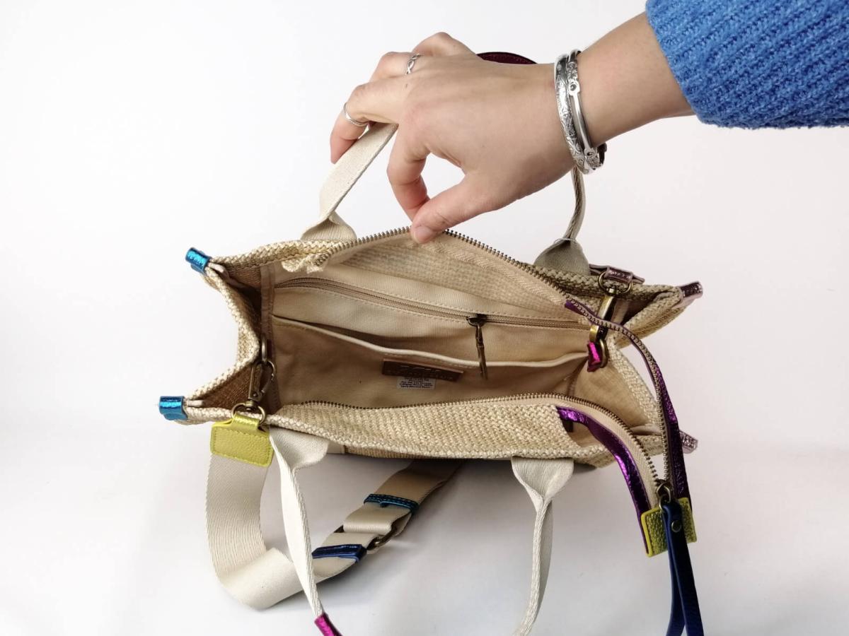 Sac cabas femme original, extérieur en raphia, intérieur en toile avec deux poches dont une zippée.