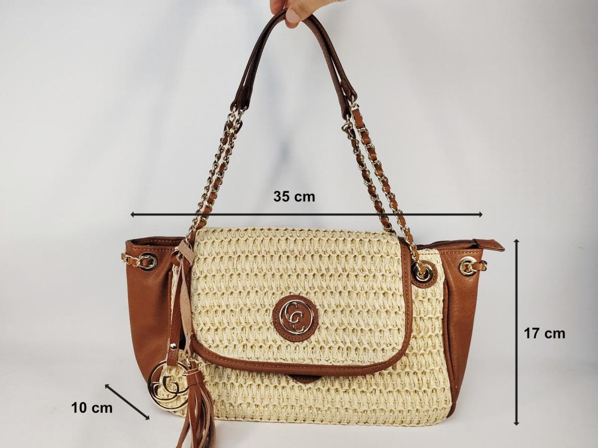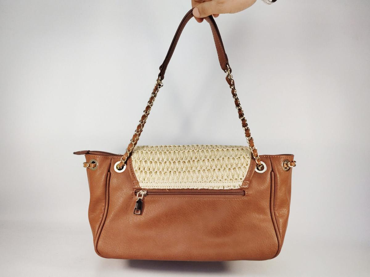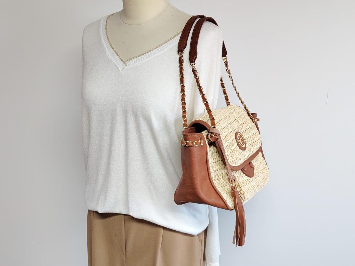 Petit sac à main épaule femme raphia beige et empiècements camel avec deux poches à l'intérieur du sac (une poche normale et une zippée) et une poche zippée à l'arrière du sac, idéal pour les clés.