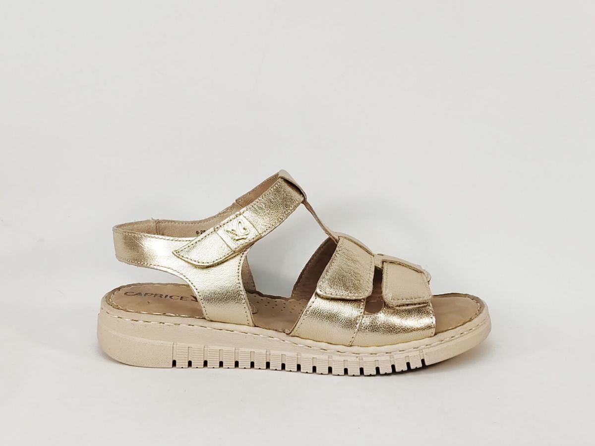 Sandale femme pieds larges chic et confortable tout en cuir souple doré tendance à pas cher CAPRICE 28102 en destockage largeur G avec trois velcro.