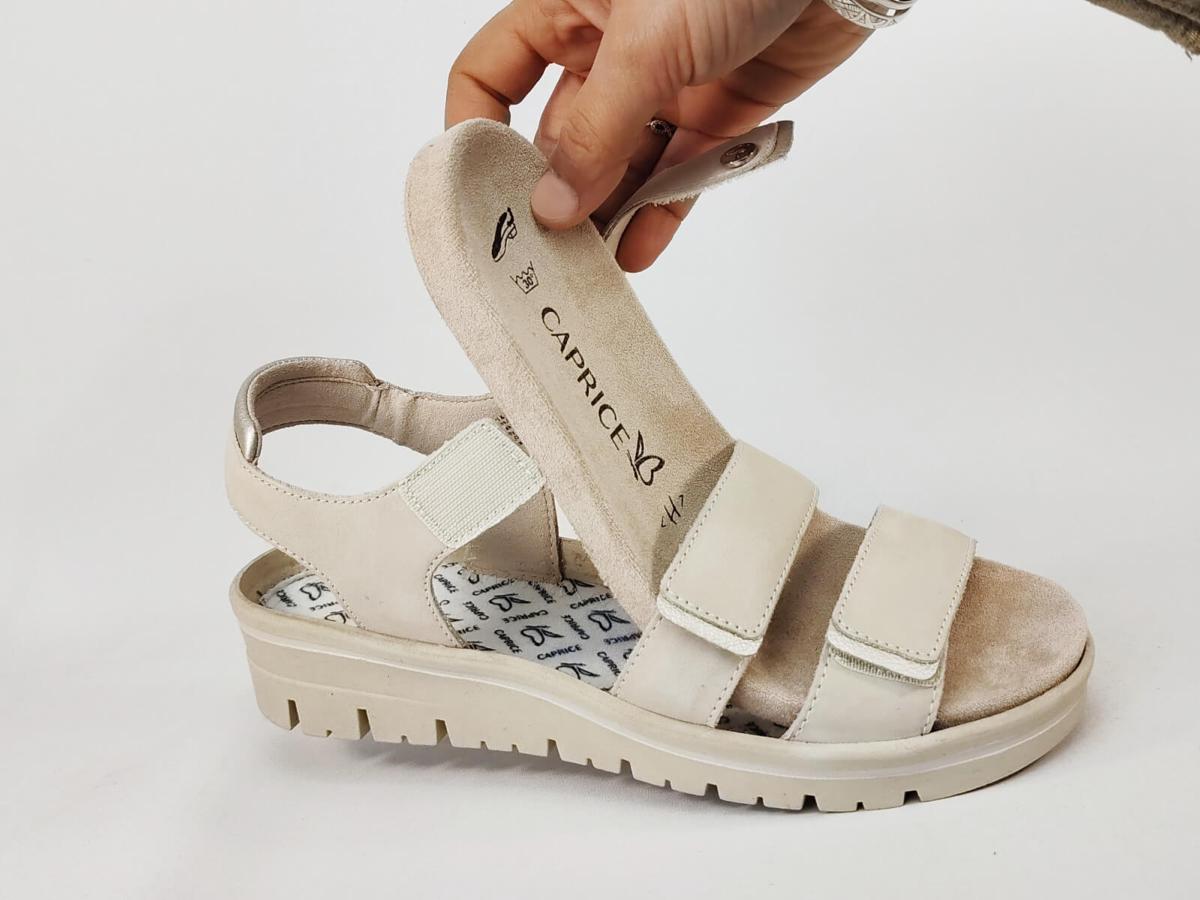 ↓ Plus d'info sur cette sandale femme pied large et sensible chic et confortable en cuir beige à scratch, semelle amovible CAPRICE 28705 Largeur H ↓